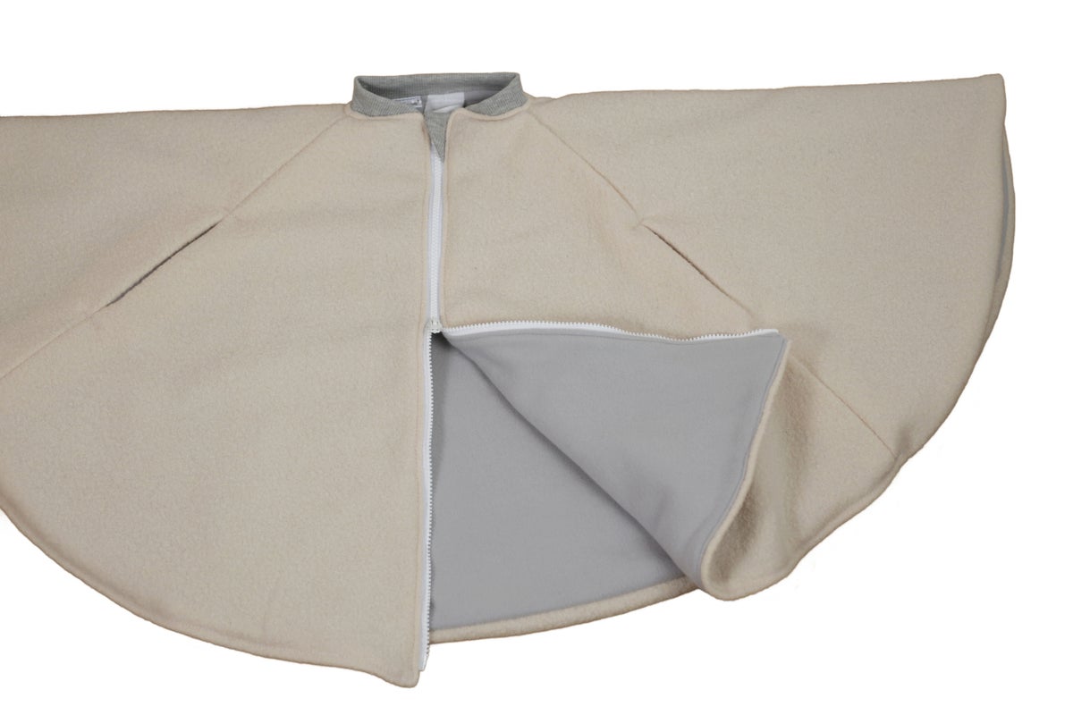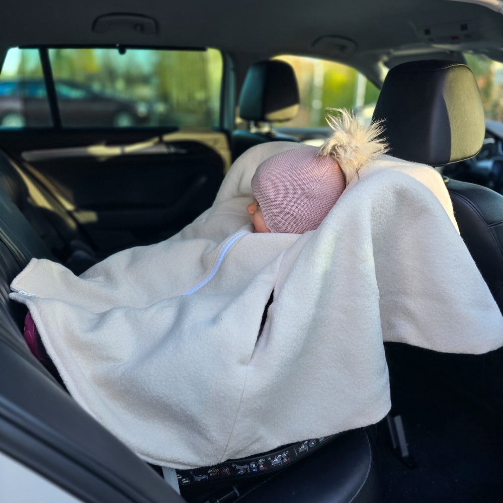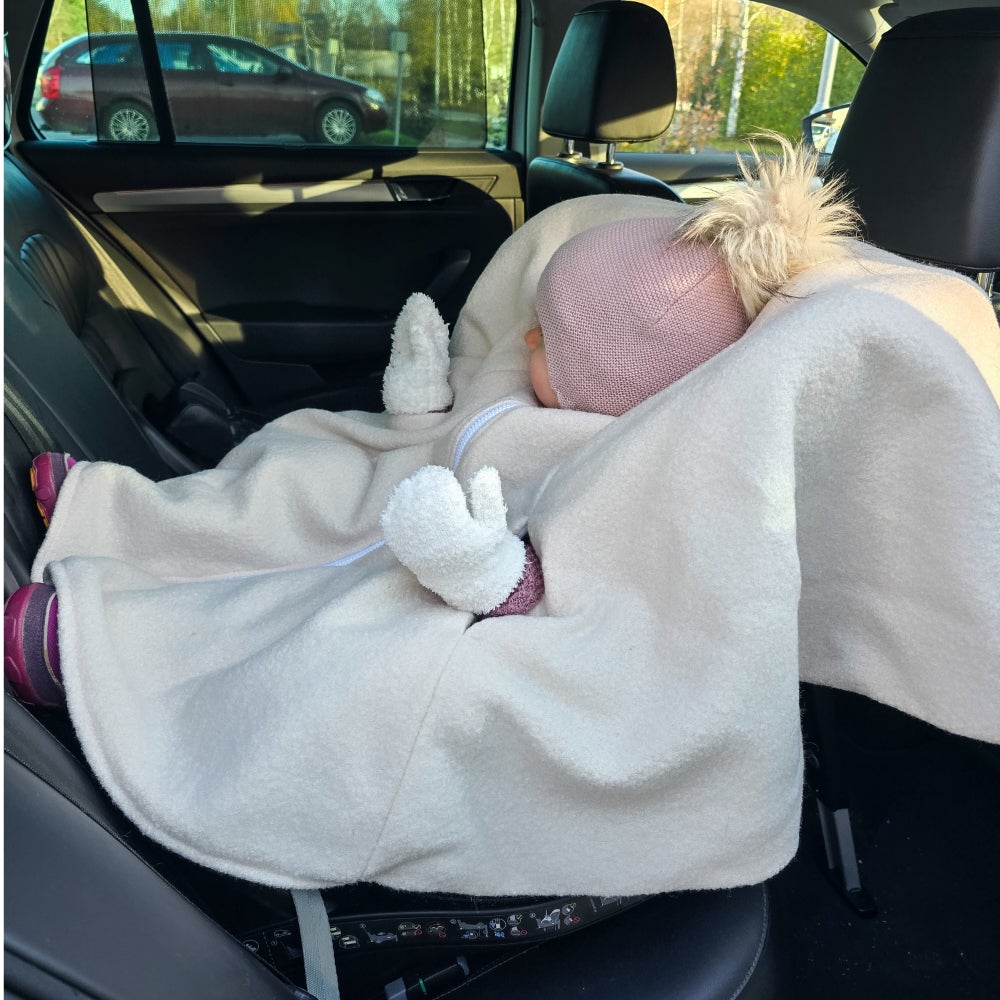 Lämpöinen, pehmeä ja hengittävä turvaistuinviitta autoiluun. Turvaistuinviitassa on kaksilukkoinen vetoketju edessä, joka edesauttaa turvaistuimen vöiden kiinnittämistä helposti. Kaula-aukon kutittamaton bomber -tyylinen kaulus on turvallinen vaihtoehto autoillessa. Vetoketjun vetimen suojana on lista, jotta talvella herkkä leuan iho ei raapiudu vetoketjusta. Käsiaukkojen suojaksi on mahdollista saada suojaläpät. Meillä ei ole kokemusta pääseekö pelkistä aukoista viima läpi.