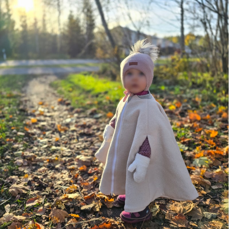 Kuvassa oleva lapsi on 82cm pitkä, iältään 1v 10kk ja hänellä on 2-5v. viitta päällä.